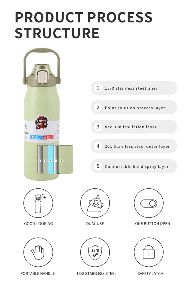 Borraccia sportiva con isolamento sottovuoto in acciaio inossidabile da 1,7 litri con coperchio della maniglia